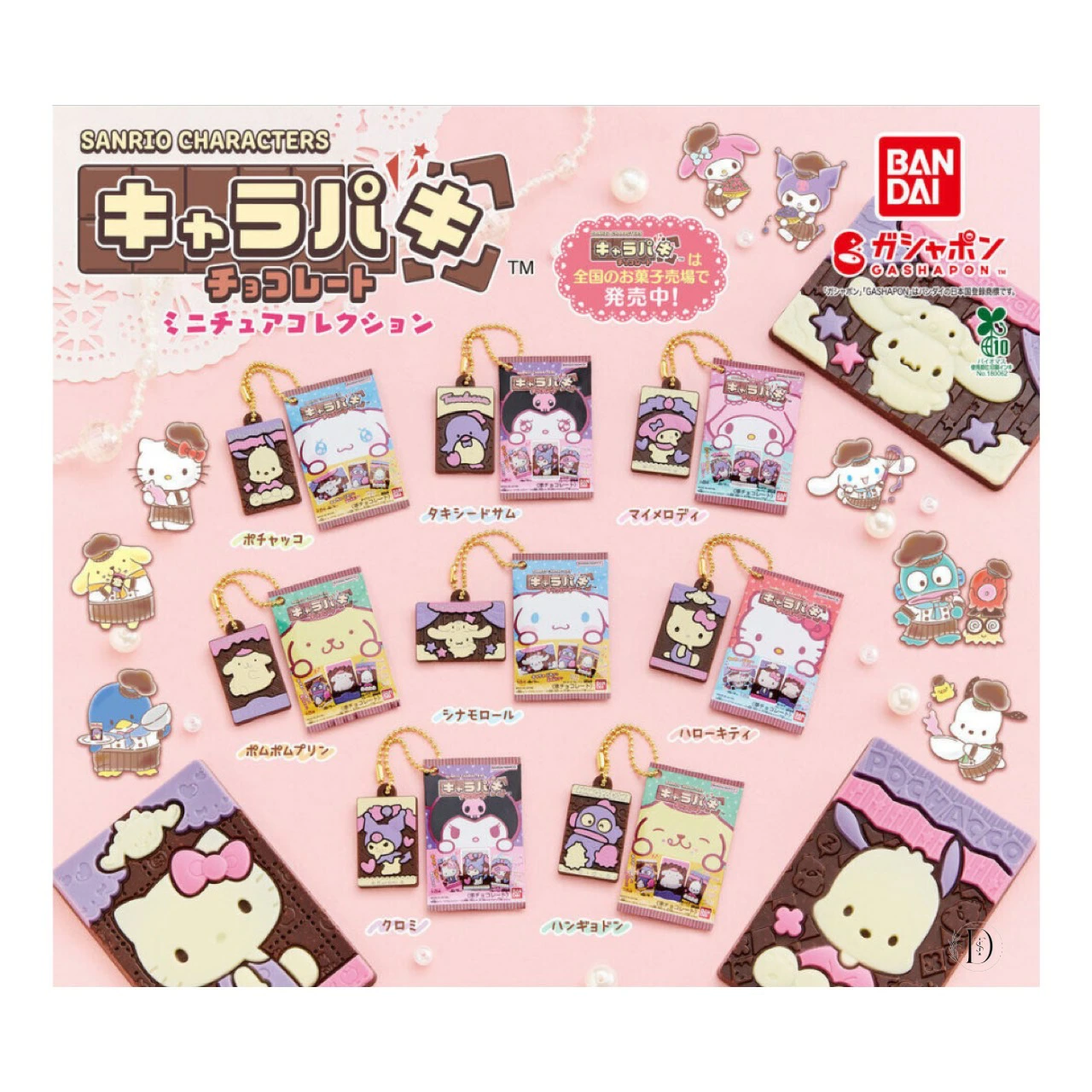 人気シリーズ『サンリオキャラクターズ キャラパキ』が、全8種のミニチュアチャームとなってガシャポンに登場!ハローキティやシナモロール、マイメロディなど、個性あふれるキャラクターが手のひらサイズで可愛く再現されています。カバンやキーリングに取り付ければ、身近にサンリオの世界を楽しめるコレクションアイテムです。